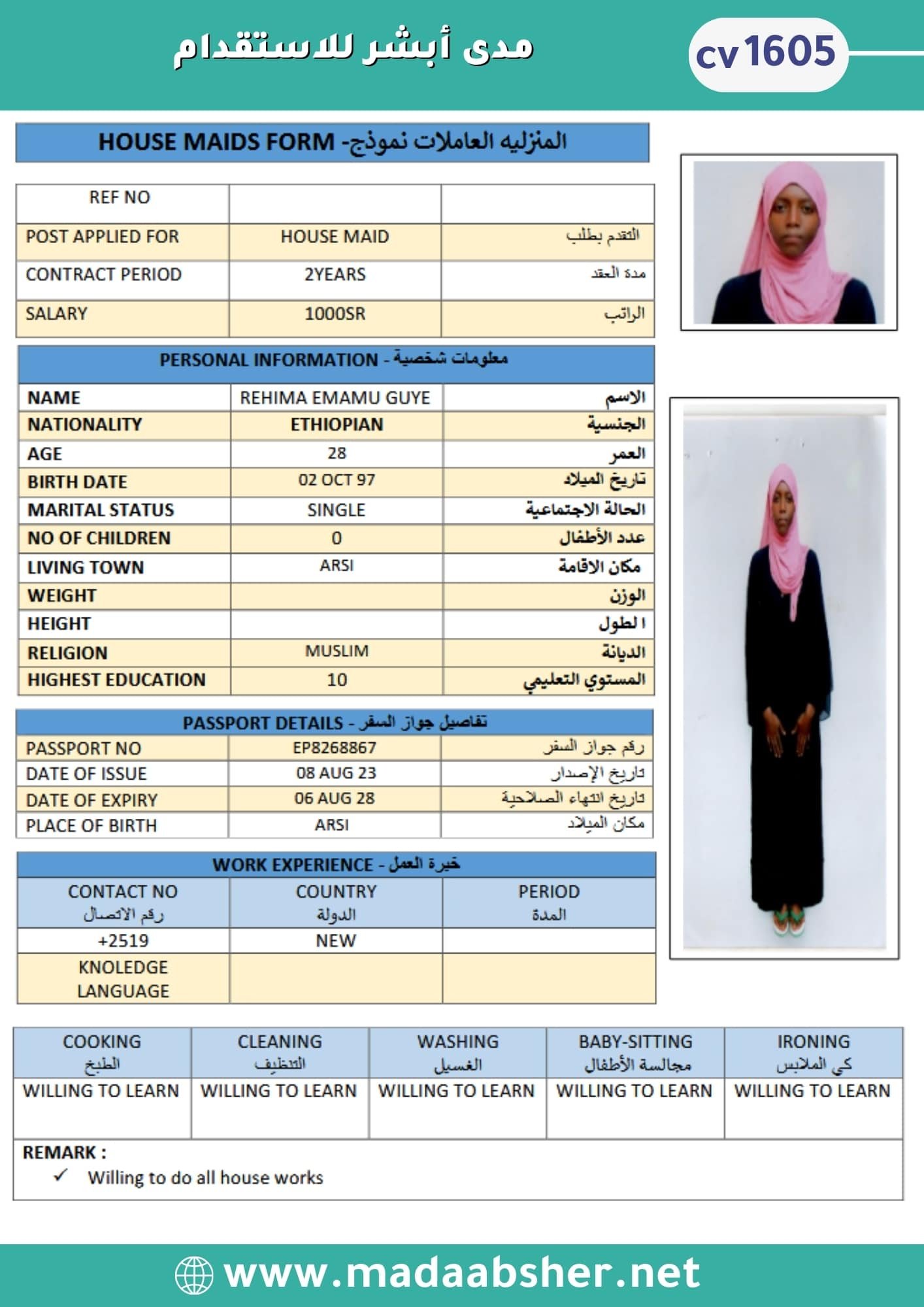 • خبرة وكفاءة عالية في جميع الأعمال المنزلية