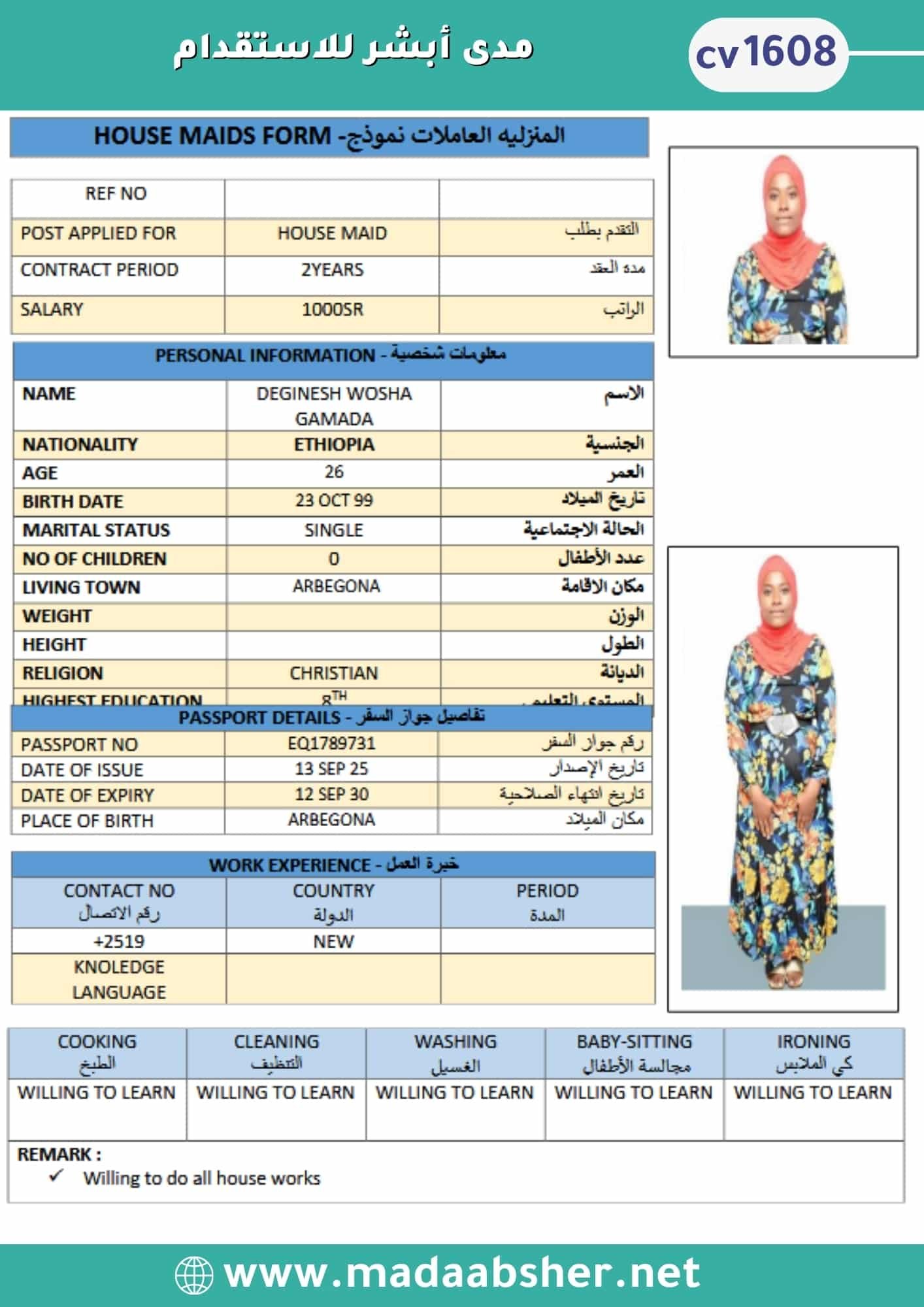 • خبرة وكفاءة عالية في جميع الأعمال المنزلية