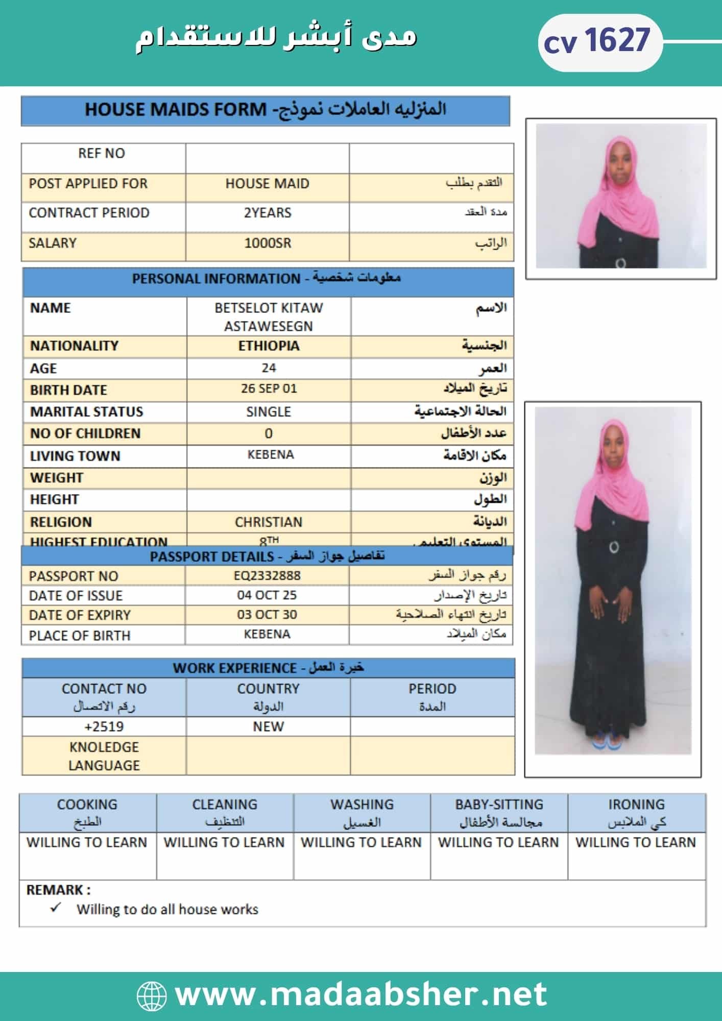 • خبرة وكفاءة عالية في جميع الأعمال المنزلية