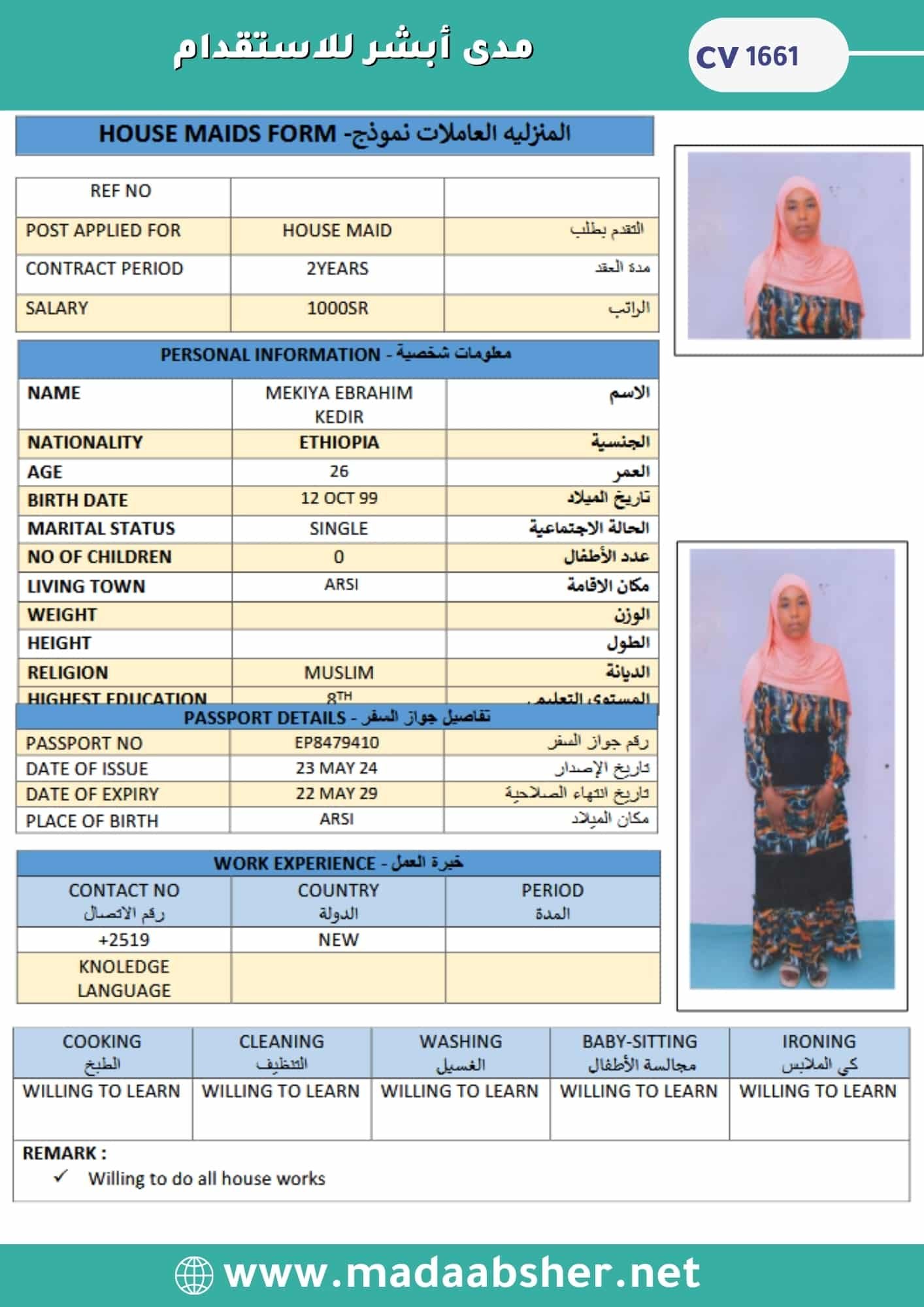 • خبرة وكفاءة عالية في جميع الأعمال المنزلية