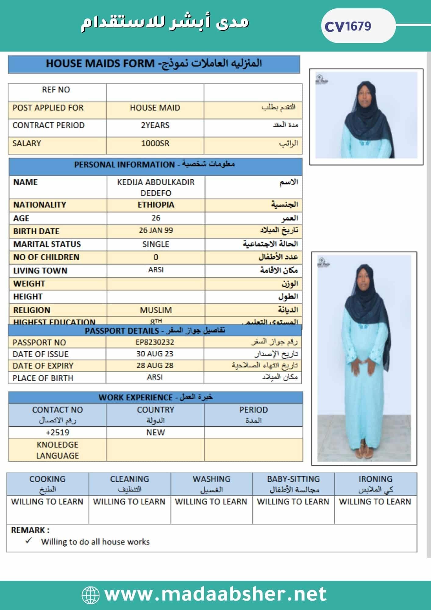 • خبرة وكفاءة عالية في جميع الأعمال المنزلية