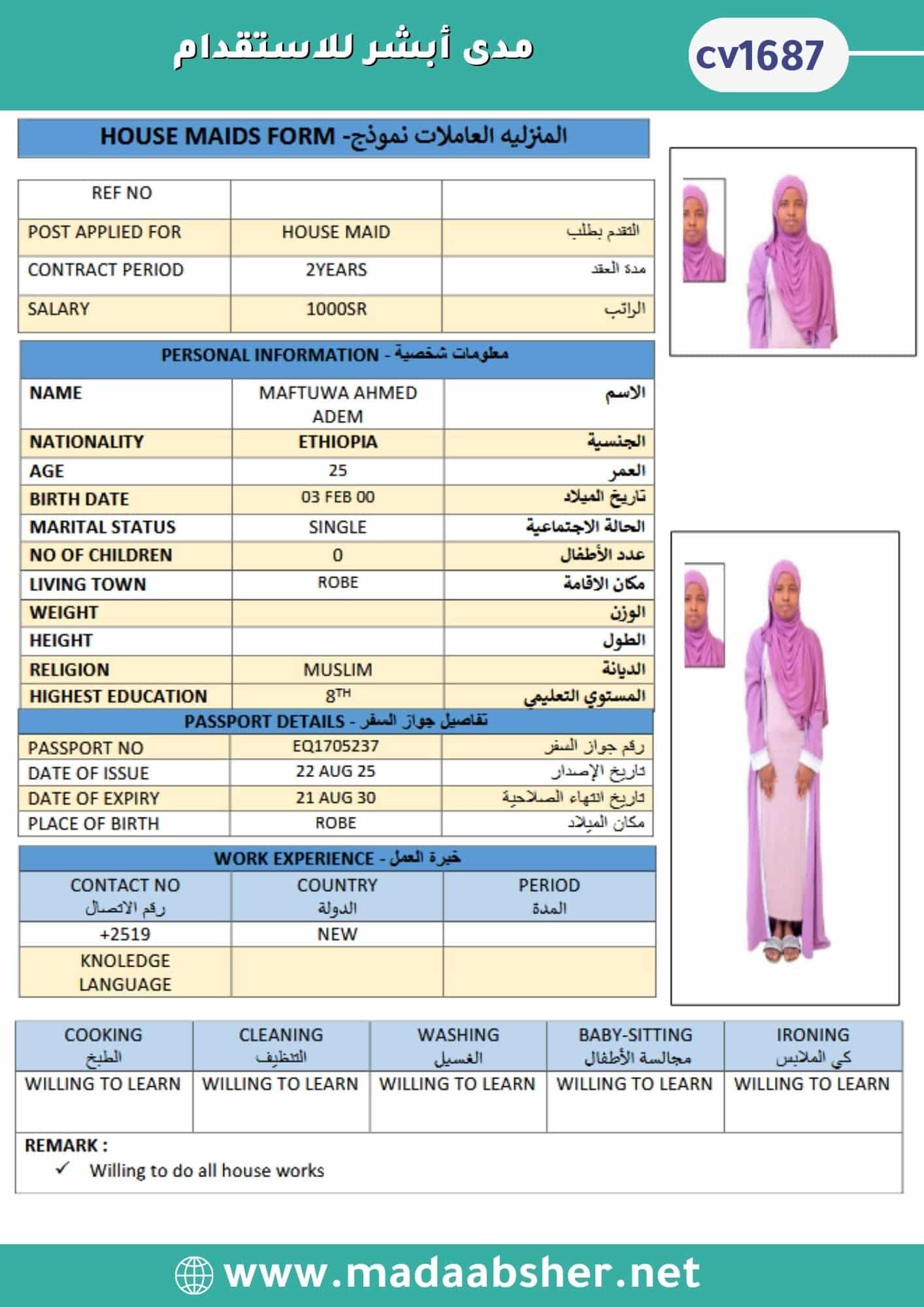 • خبرة وكفاءة عالية في جميع الأعمال المنزلية