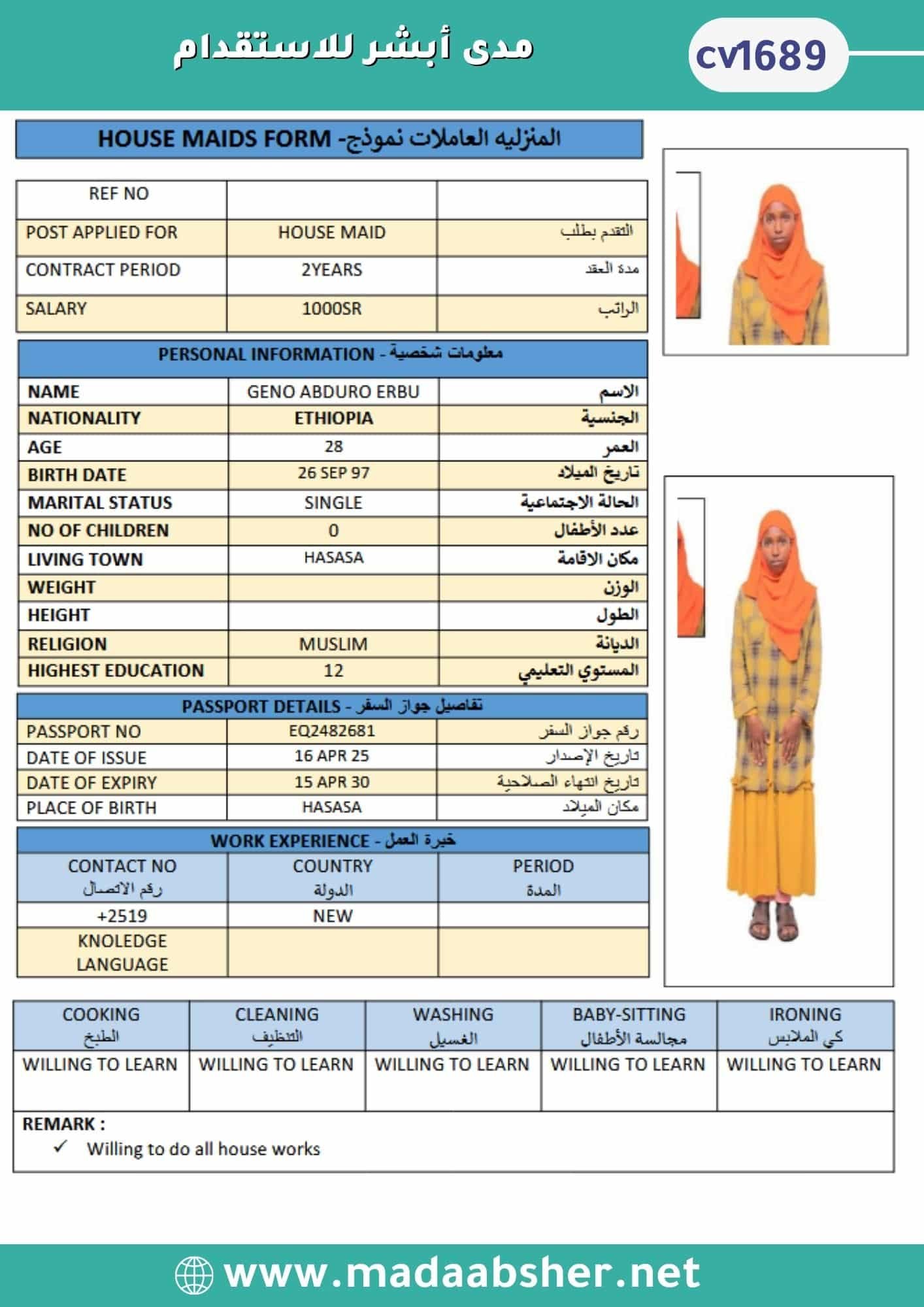 • خبرة وكفاءة عالية في جميع الأعمال المنزلية