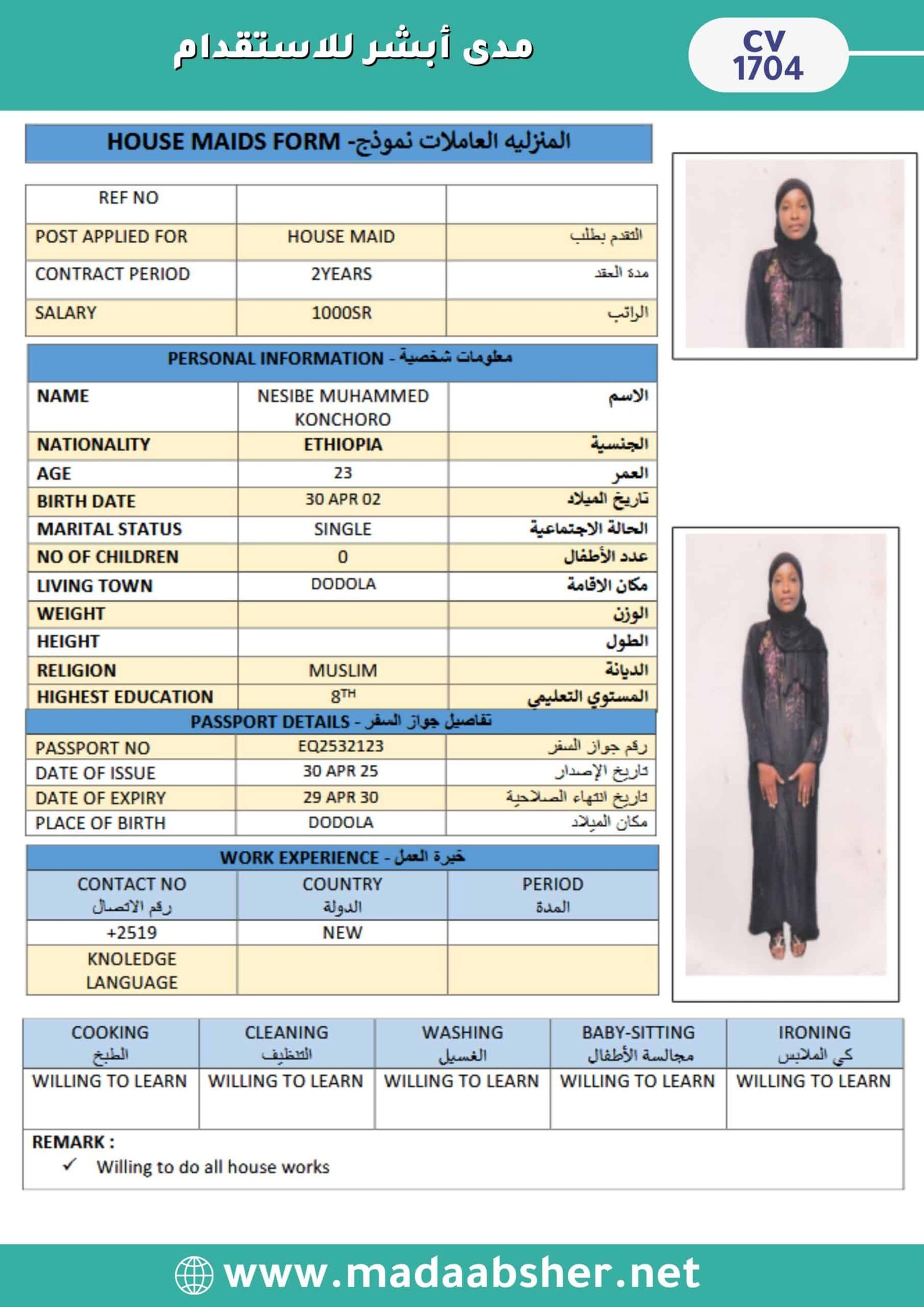 هل تبحث عن أفضل خدمات استقدام العمالة المنزلية من إثيوبيا في المملكة العربية السعودية؟ نحن نوفر لك عاملات منزليات مؤهلات يتمتعن بالكفاءة والالتزام لضمان راحتك ومساعدتك في أداء المهام المنزلية بأعلى مستوى من الجودة والاحترافية.