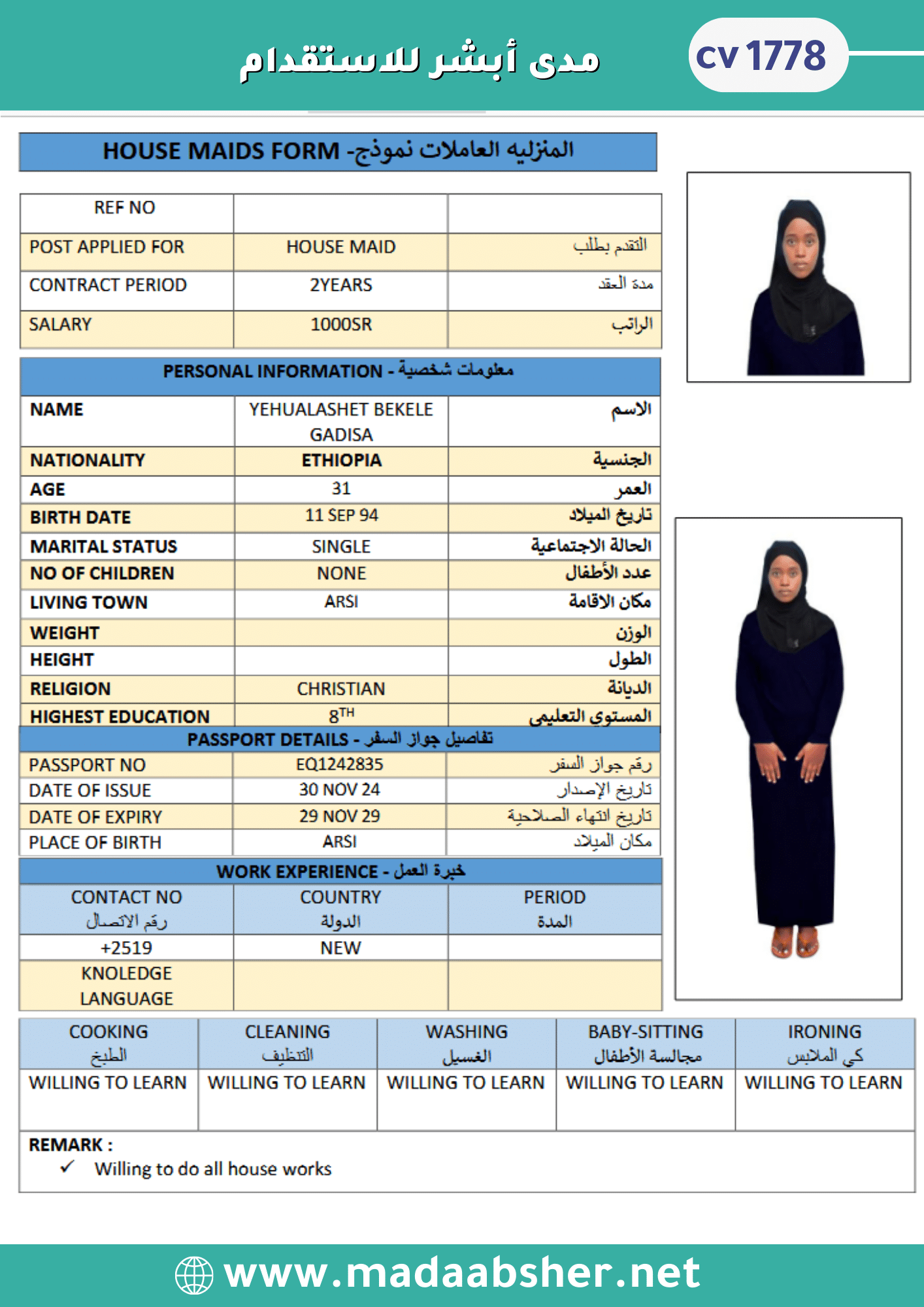 • خبرة وكفاءة عالية في جميع الأعمال المنزلية