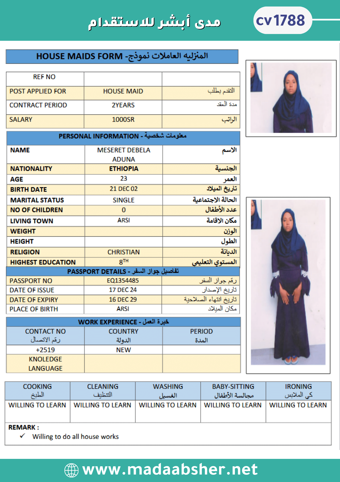 هل تبحث عن أفضل خدمات استقدام العمالة المنزلية من إثيوبيا في المملكة العربية السعودية؟ نحن نوفر لك عاملات منزليات مؤهلات يتمتعن بالكفاءة والالتزام لضمان راحتك ومساعدتك في أداء المهام المنزلية بأعلى مستوى من الجودة والاحترافية.