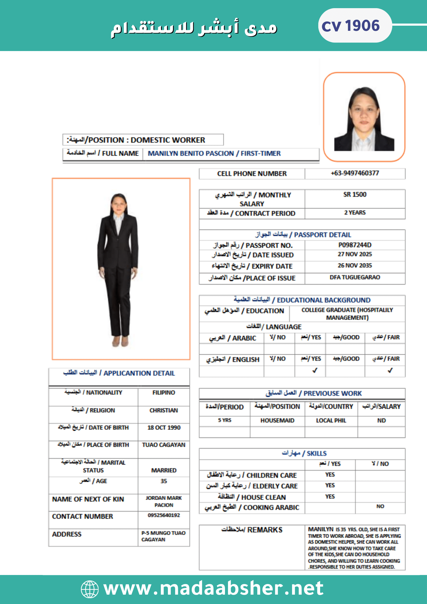 العاملات المنزلية من الفلبين يتمتعن بالعديد من المزايا والمهارات التي تجعلهن خيارًا شائعًا لدى العديد من الأسر. إليك بعض المزايا والمهارات التي يتمتعن بها: