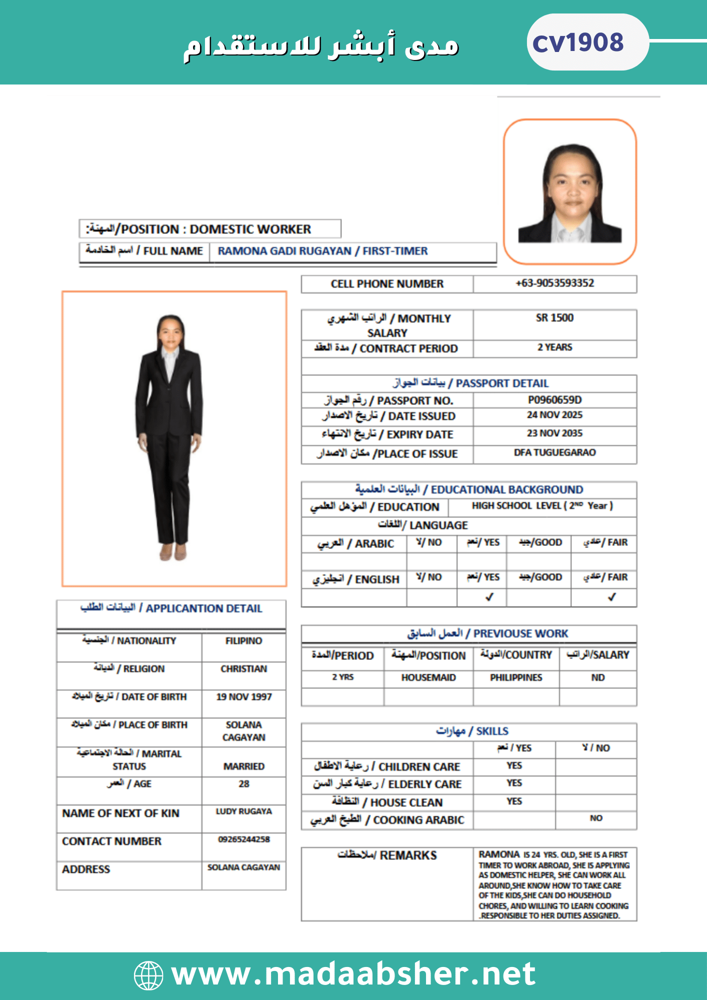 1. الخبرة: العاملات الفلبينيات يمتلكن خبرة واسعة في جميع جوانب العمل المنزلي، مما يجعلهن مؤهلات لأداء المهام بكفاءة عالية.