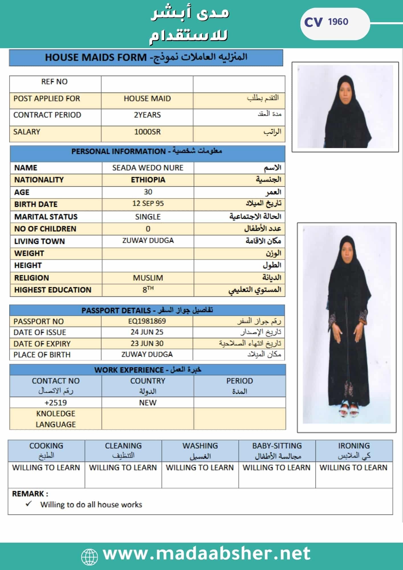 • خبرة وكفاءة عالية في جميع الأعمال المنزلية