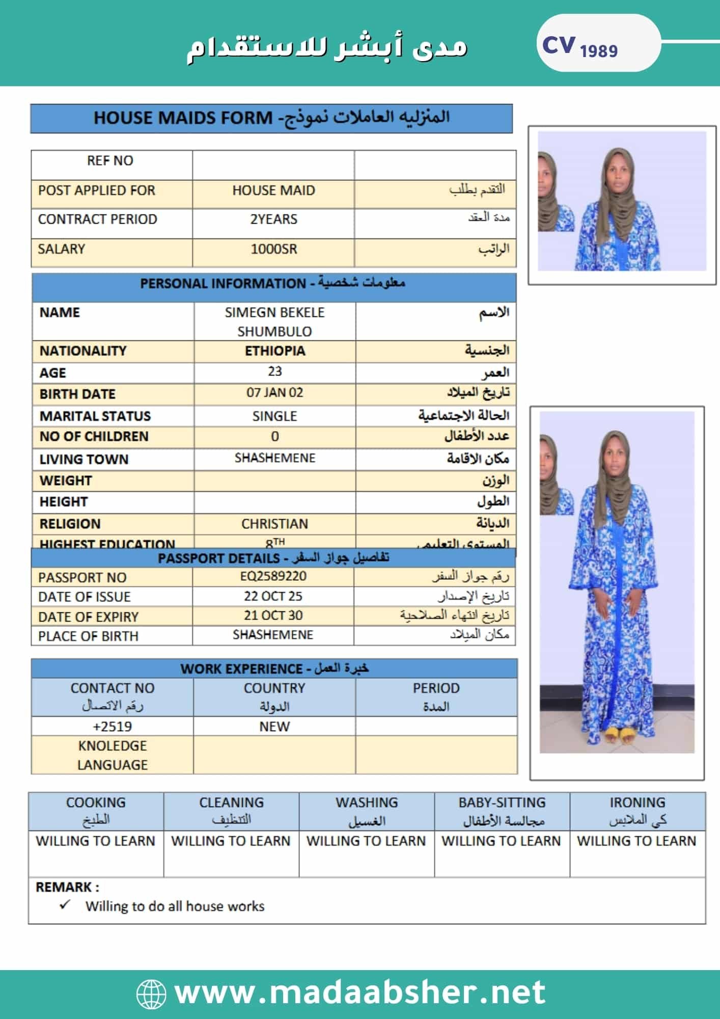 هل تبحث عن أفضل خدمات استقدام العمالة المنزلية من إثيوبيا في المملكة العربية السعودية؟ نحن نوفر لك عاملات منزليات مؤهلات يتمتعن بالكفاءة والالتزام لضمان راحتك ومساعدتك في أداء المهام المنزلية بأعلى مستوى من الجودة والاحترافية.