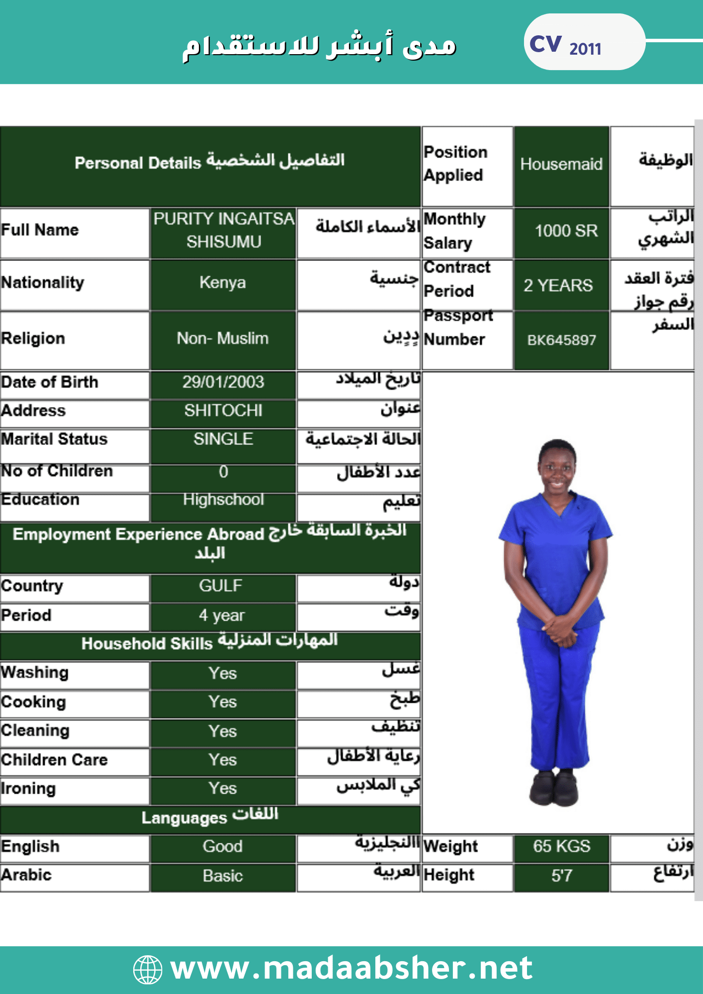 📞 للاستفسار أو البدء بإجراءات استقدام عاملة منزلية من كينيا عبر مكتب مدى أبشر للاستقدام، تواصل معنا الآن ( +966576717928)