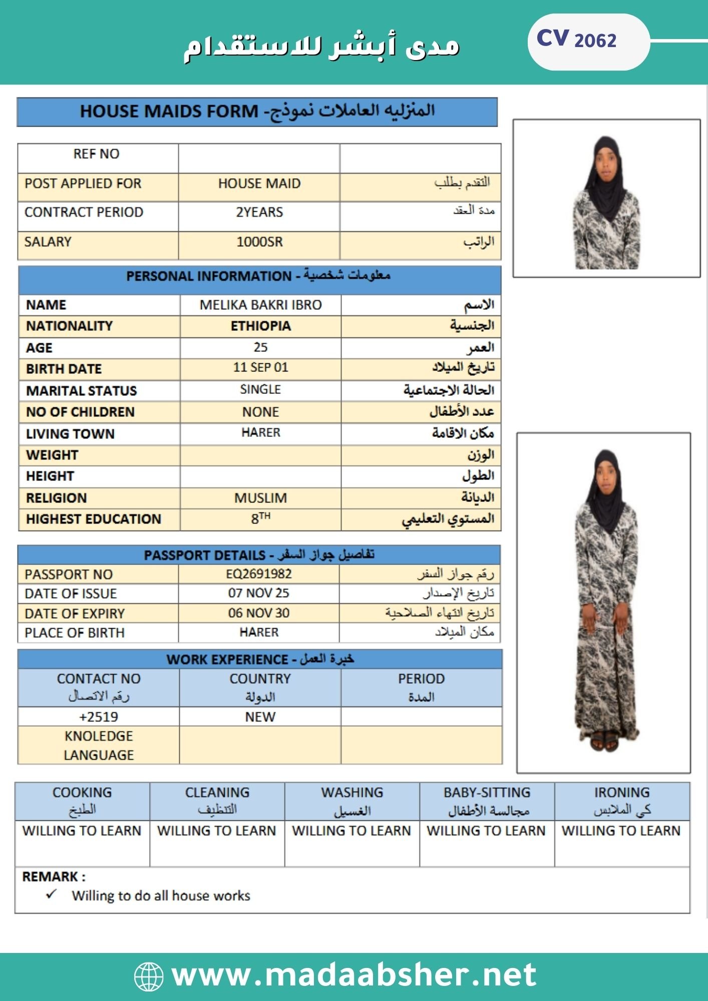 هل تبحث عن أفضل خدمات استقدام العمالة المنزلية من إثيوبيا في المملكة العربية السعودية؟ نحن نوفر لك عاملات منزليات مؤهلات يتمتعن بالكفاءة والالتزام لضمان راحتك ومساعدتك في أداء المهام المنزلية بأعلى مستوى من الجودة والاحترافية.