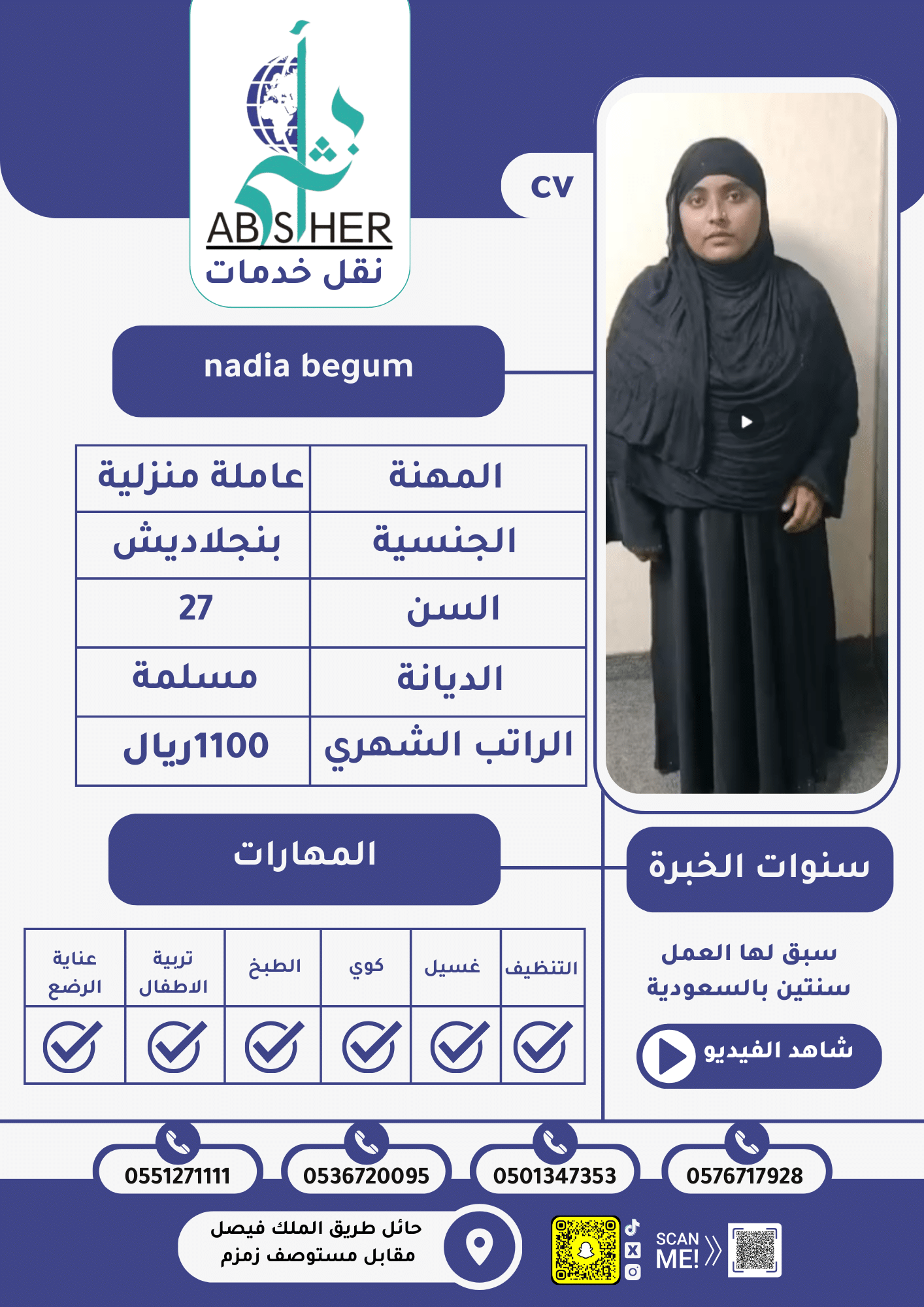 - رعاية الأطفال: لديها خبرة في التعامل مع الأطفال بمختلف أعمارهم، بما في ذلك الرعاية اليومية.
